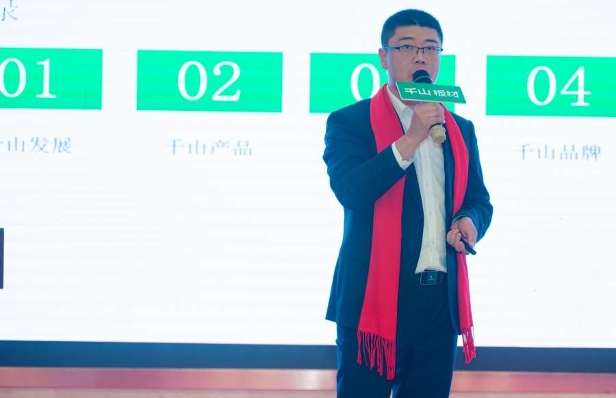 千山板材常德運營中心總經理肖波致辭。肖總鋪開產品升級迭代的大背景,給大家分享了千山板材在常德市場的發展動態以及接下來的奮斗目標。