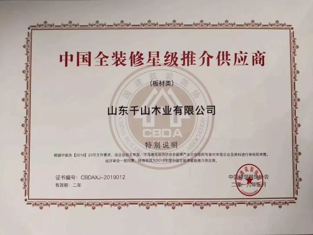 2019年5月,千山憑借高質量的產品、良好的信譽成功入圍由中國建筑裝飾協會主辦的2018年度《全裝修供應商推介目錄》企業名單及《全裝修星級供應商推介目錄》。