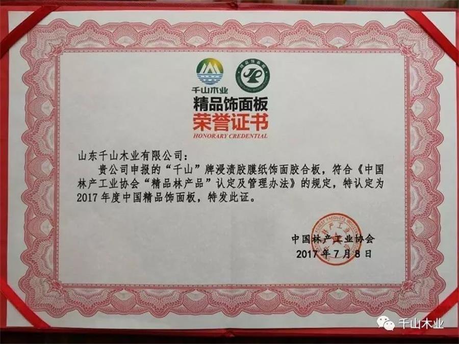 2017年7月,中國木質林產品質量提升與品牌建設高峰論壇在廣州舉行,千山應邀參加,并榮獲2017年度“精品人造板(含飾面板)”、“精品裝飾紙”榮譽。