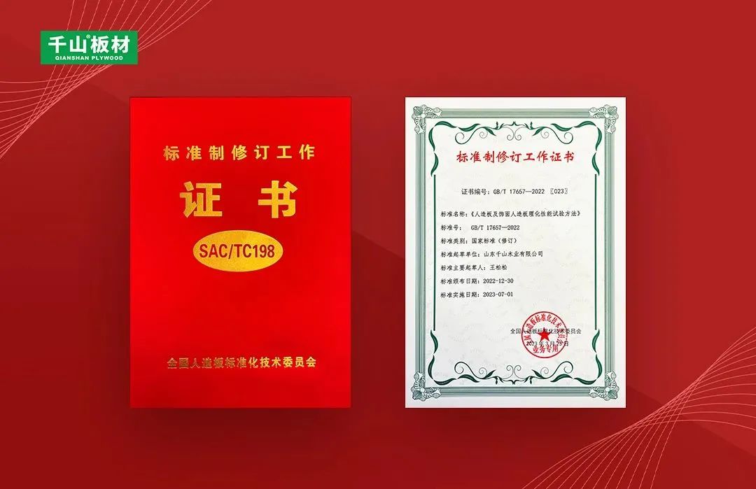 2023年3月,由全國人造板標準化技術委員會、中國林業科學研究院木材工業研究所、林業產業標準化國家創新聯盟主辦的《人造板及飾面人造板理化性能試驗方法》等新頒布標準宣貫培訓暨產業發展研討會在浙江南潯召開,千山應邀出席并獲頒國家標準制修訂工作證書。