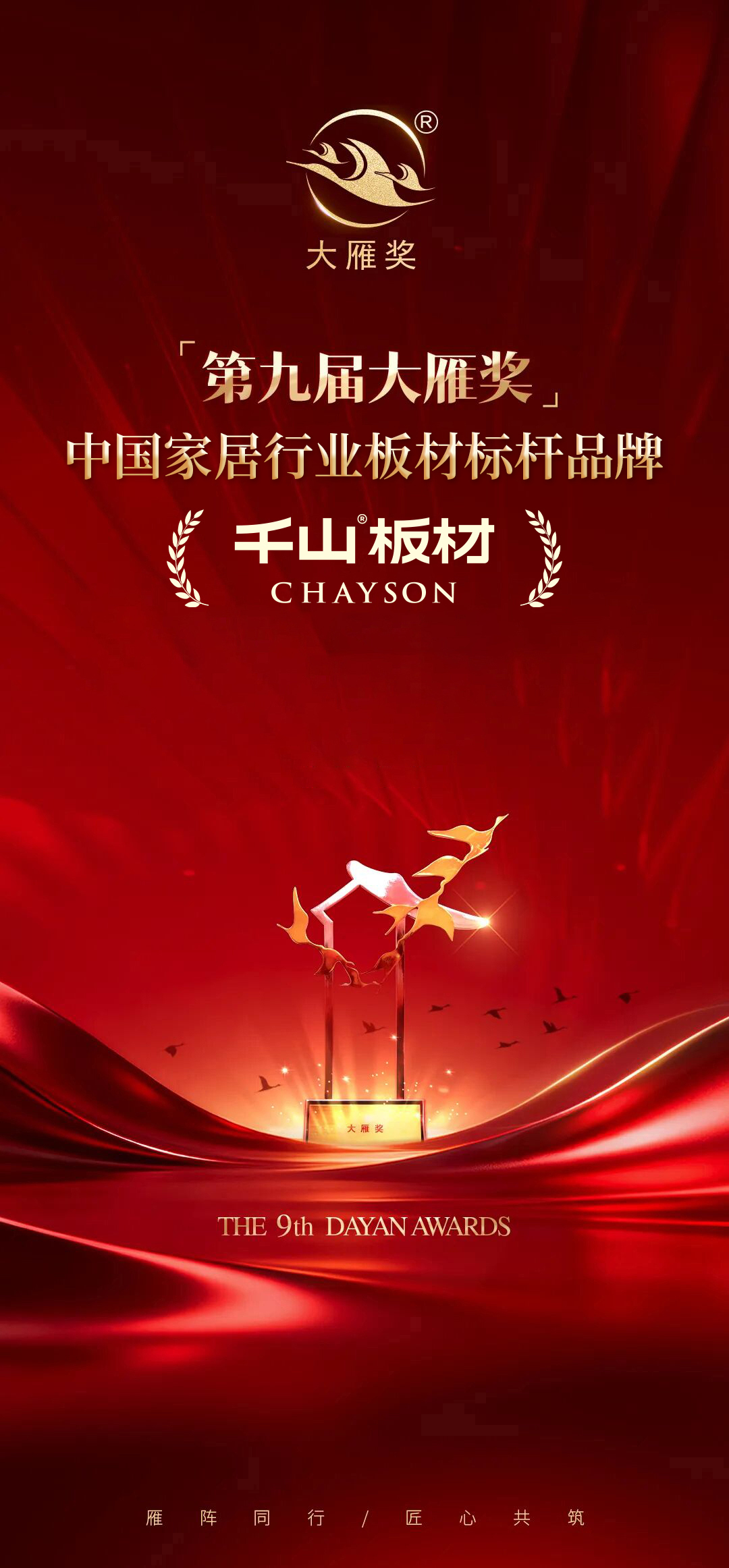 榮譽(yù)加冕,亦是全新起點(diǎn)。此次摘得大雁獎(jiǎng),是行業(yè)與市場對(duì)千山板材的雙重肯定,更是其持續(xù)前行的動(dòng)力。未來,千山板材將繼續(xù)堅(jiān)守 “高質(zhì)價(jià)比” 定位,深耕技術(shù)研發(fā)與產(chǎn)品創(chuàng)新,與行業(yè)同仁攜手同行、匠心共筑,以硬核實(shí)力推動(dòng)板材行業(yè)品質(zhì)升級(jí),持續(xù)助推中國家居產(chǎn)業(yè)高質(zhì)量發(fā)展,為千萬家庭打造理想家!