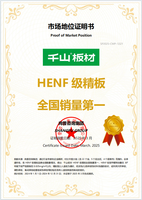 28年老牌板材大廠的深厚積淀,是千山高質(zhì)價(jià)比的堅(jiān)實(shí)后盾。作為中國板材國家品牌、HENF級(jí)精板全國銷量第一品牌,千山擁有全方位的品質(zhì)認(rèn)證體系——HENF級(jí)環(huán)保認(rèn)證、兒童安全認(rèn)證、近0氣味認(rèn)證,自主研發(fā)的凈醛、抗菌、抗病毒技術(shù)均獲得權(quán)威檢測報(bào)告支持。依托成熟的國產(chǎn)智能化供應(yīng)鏈,我們實(shí)現(xiàn)產(chǎn)能穩(wěn)定、品控嚴(yán)格、成本可控的三重保障,讓高端品質(zhì)板材以親民價(jià)格落地,真正做到“好板不貴、品質(zhì)可鑒”。