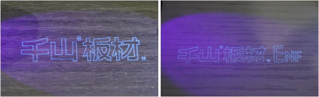 千山板材每張板材表面都印有隱形防偽標識,使用紫光手電筒照射板材表面,顯現“千山板材”  “千山板材ENF”。