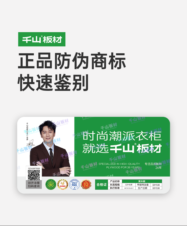嚴控質量標準,捍衛消費者權益,千山板材一直致力于為消費者提供優質的產品和服務。千山板材通過不斷優化精進防偽設計,來抵制假冒偽劣產品。今天,千山板材防偽攻略特別上線,為您的安心保駕護航!01 查防偽商標 正品千山板材均有可鑒別、可查詢的防偽商標及防偽編碼,刮開二維碼涂層,微信掃描二維碼,即可查
